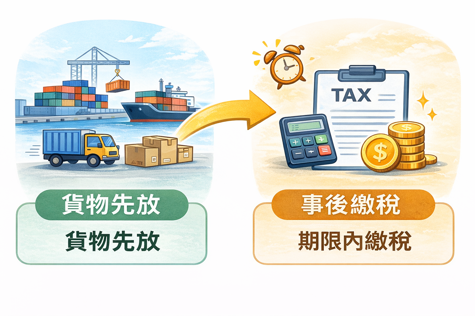 進口貨物「先放後稅」是指經海關核准的進口納稅義務人,提供擔保(現金、銀行保證書等)後,進口貨物可先放行提貨,再於稅費繳納證送達之翌日起 14 日內繳納稅費。此制度能加速通關、提升資金運用效率,適用於一般進口案件,且擔保額度可重複循環使用。
